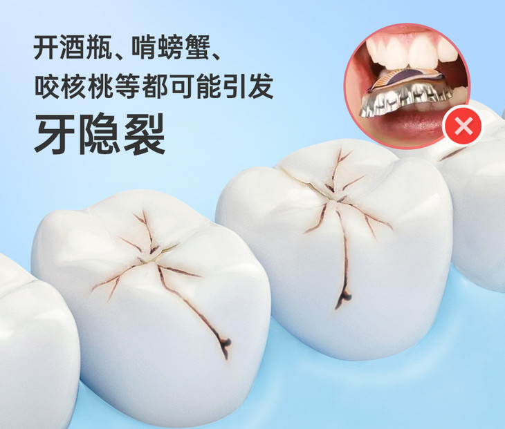 牙齿裂开后,会出现肉眼不可见的细小裂纹(牙隐裂)。牙神经露出,一吃冷热酸甜就酸痛,时间久了牙髓病变,再也回不去了。