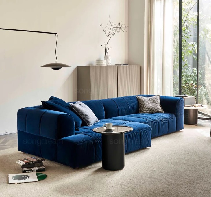 百搭舒适魔方沙发。设计师将经典方块蓝融入现代美学,沙发表面呈现分割方块,如魔方趣味十足,灵活模块组合设计,轻松驾驭大小空间。宝石蓝丝绒材质,慵懒精致的褶皱设计,赋予沙发独特的高级感和放松的享受。采用OKE硬边工艺,宽大的沙发接触面,具有柔弹舒缓的坐感和出色的承托力。