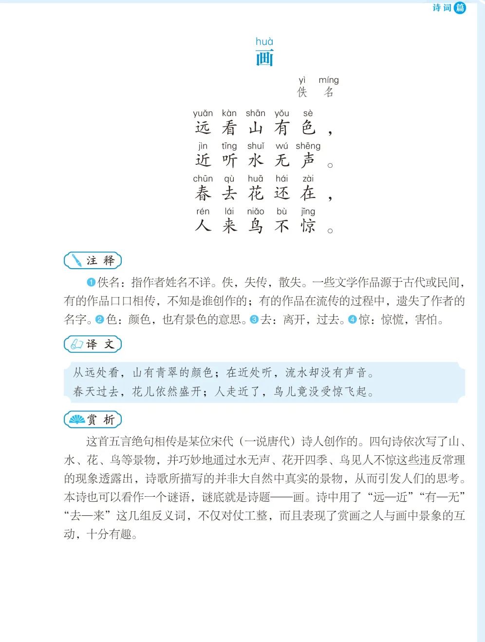 为方便学生诵读,本书的诗歌均采用全诗注音(均注本音,不注变调),文言文和名言则采用了难字注音。