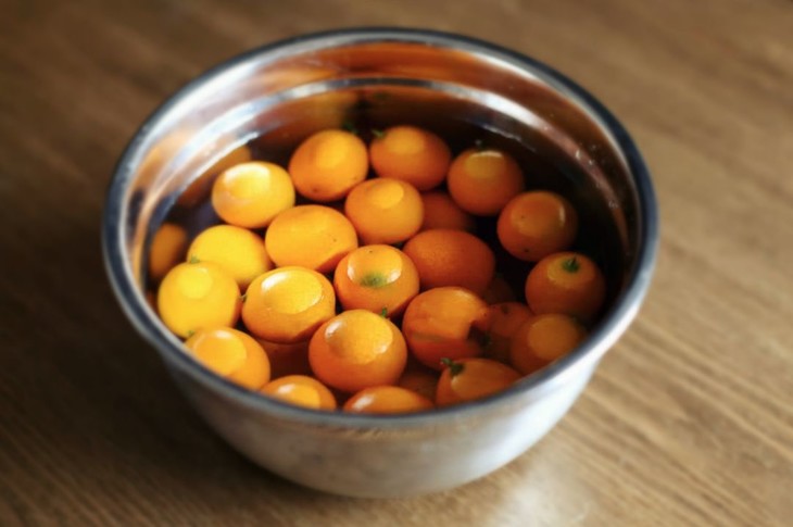 1、将金桔冲洗干净后放入淡盐水中浸泡15~30分钟;