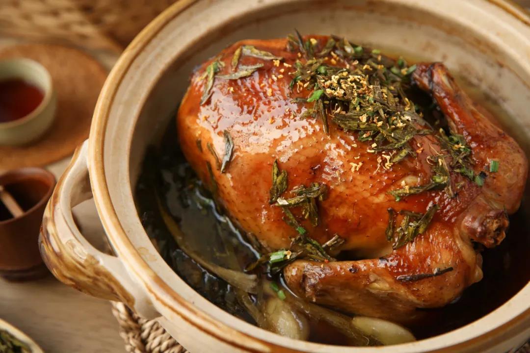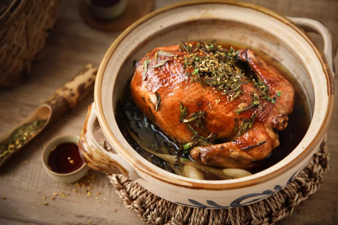茶香鸡是一道传统的杭帮菜,融合了杭州特产的龙井茶和秋天杭州满城开遍的桂花香气,广受欢迎。