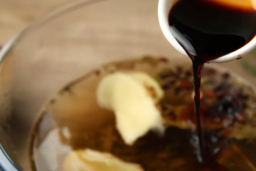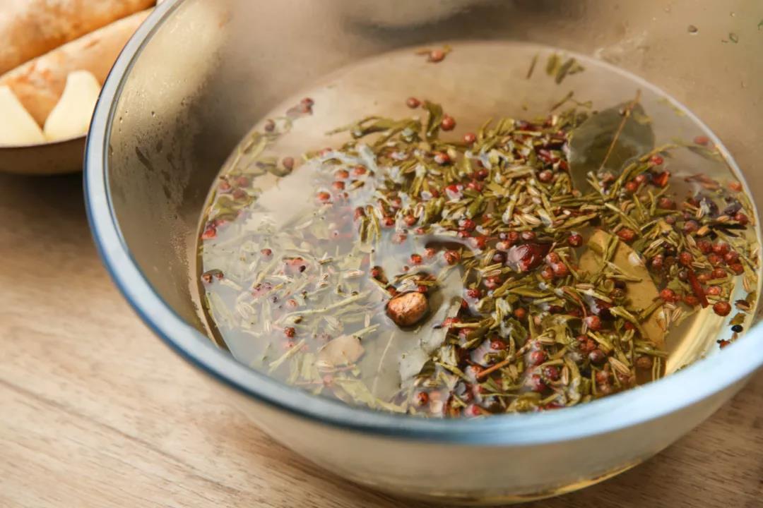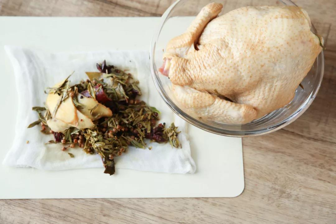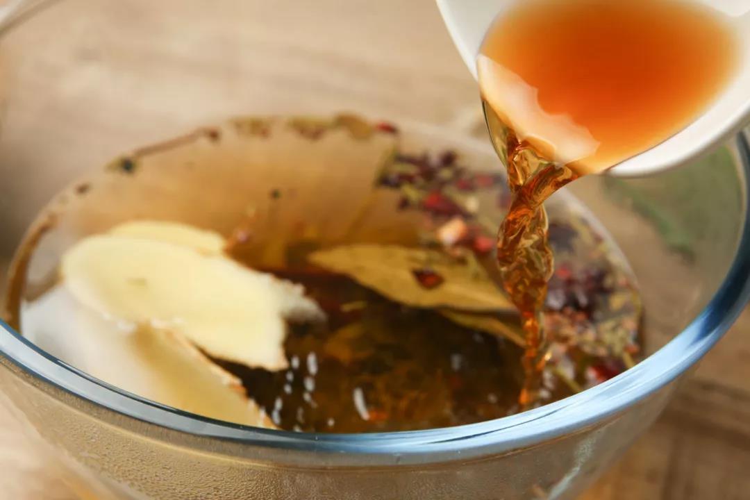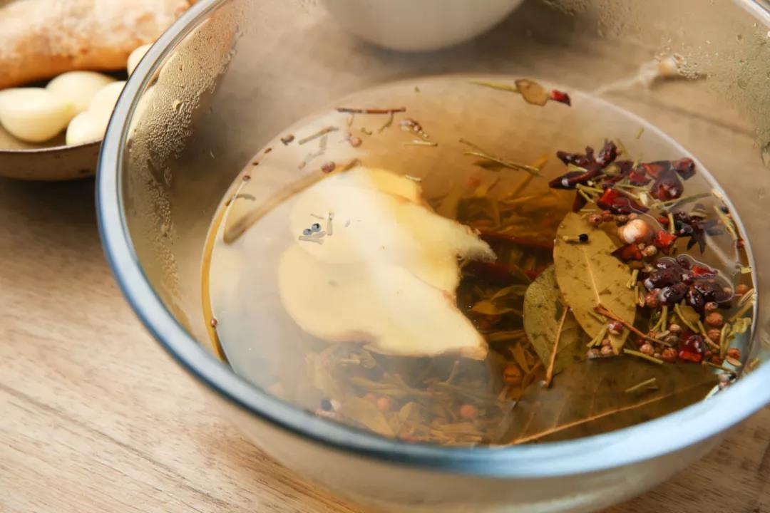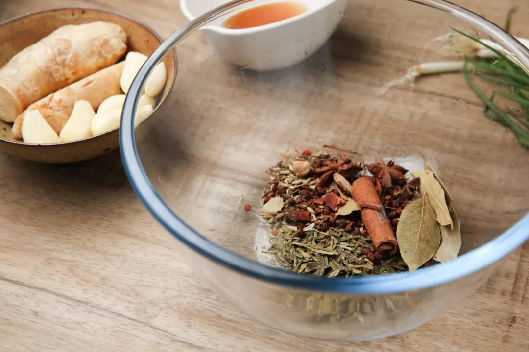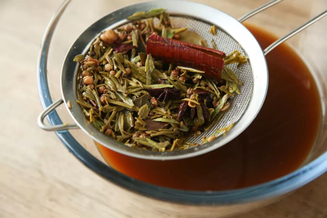 [1]首先我们来准备香料茶汤,用这个茶汤充分腌制过的鸡会更鲜嫩入味——将15克龙井茶和花椒、八角、香叶、桂皮等干香料混合放入大碗中。