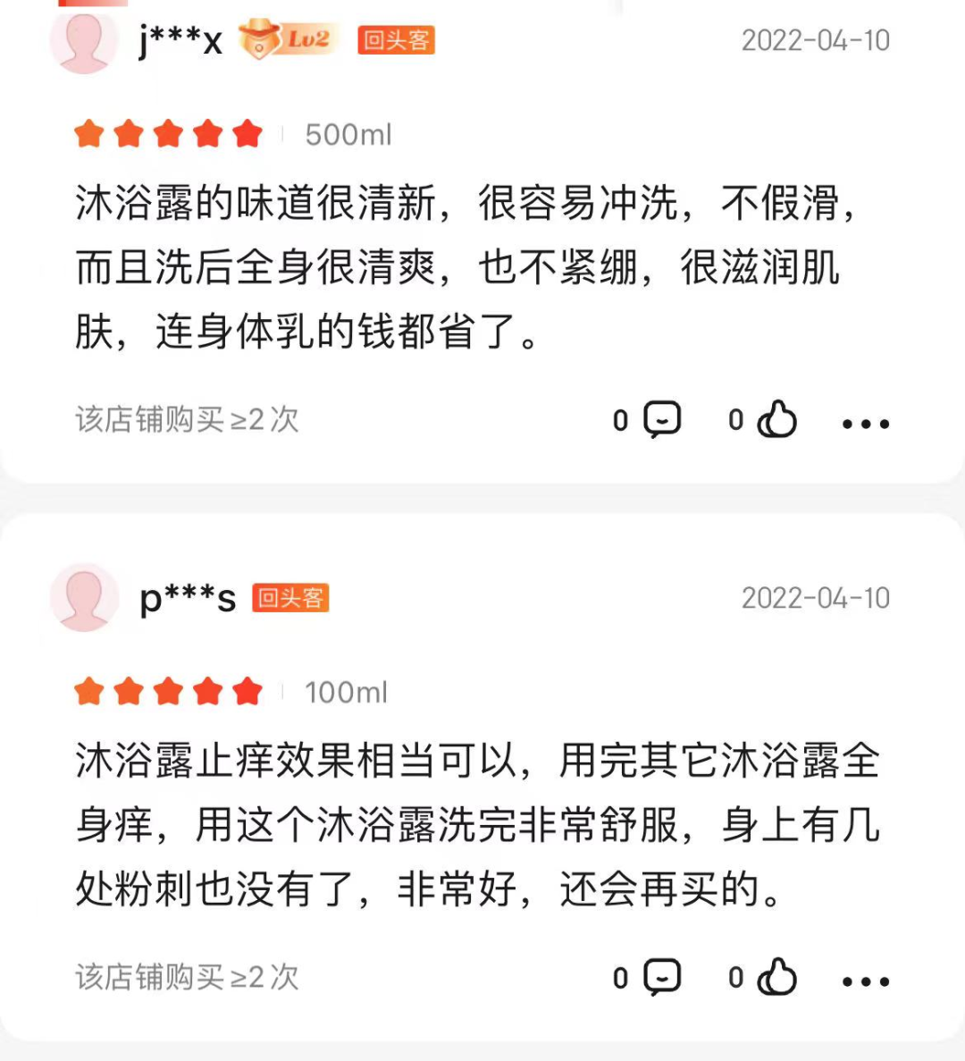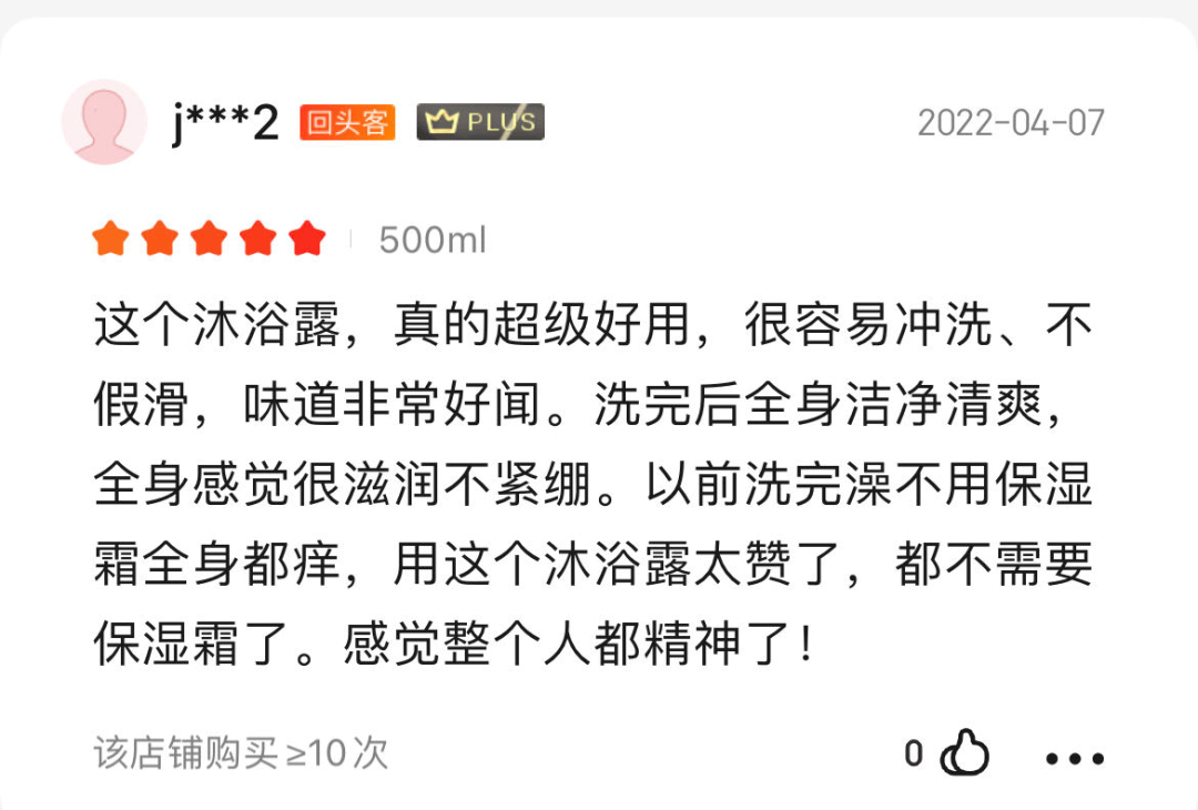 大家最直观的使用感受是,不用搓澡就可以洗的很干净,特别容易冲洗、不假滑, 皮肤很滋润不紧绷,洗完澡整个人都清爽舒适了。干性皮肤洗完之后全身也会很滋润,不痒了,也不会起皮屑了。另外,油性皮肤、螨虫痘、敏感肌、容易长小红疙瘩的皮肤,用了之后也有显著改善。