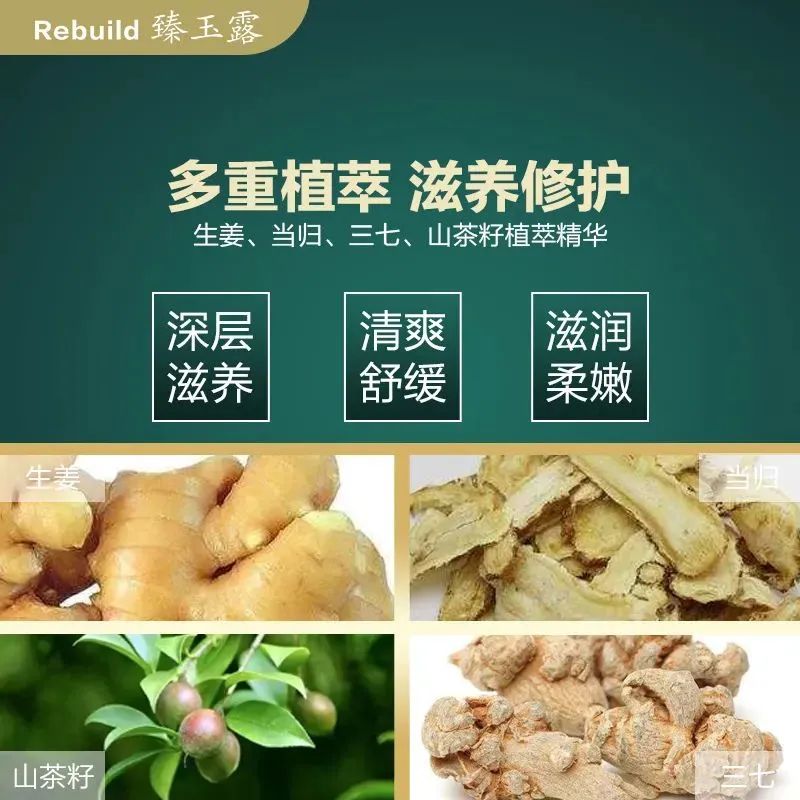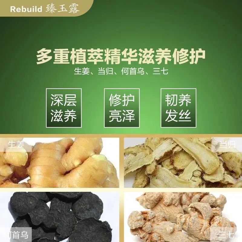 臻玉露Rebuild洗发露,原生姜汁含量高达35%,复配何首乌、当归、三七、侧柏叶植萃精华,能够全方位补给头皮、毛囊和头发的营养,帮助修护头皮屏障、滋养毛囊并提升黑色素干细胞活性。
