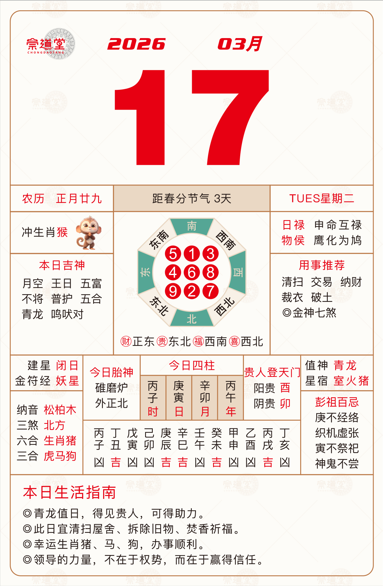 今天容易过于自信,做事前没考虑周全,既容易忽略别人的感受,也可能因为急躁冲动给自己增添压力,甚至会为了讲 “义气” 而破财。建议多吃些素食,待人处事温和一些;开车时务必注意安全,随身携带个小罗盘也能图个安心。