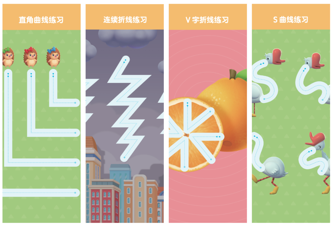 很多妈妈都反映,孩子到了4岁还不会画直线。洪恩的控笔练习,光“线”这一项运笔,就从长线、斜线、折线、到不规则线条、弧线、V字线,拆分的非常细!