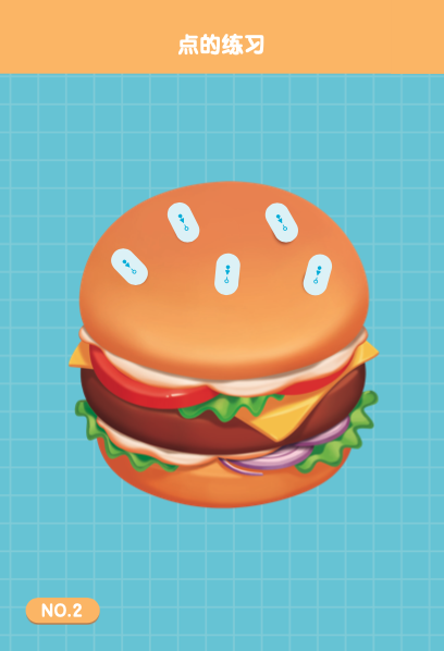 比如这张图片,通过给汉堡上加上小芝麻,锻炼孩子学习写点(、)。