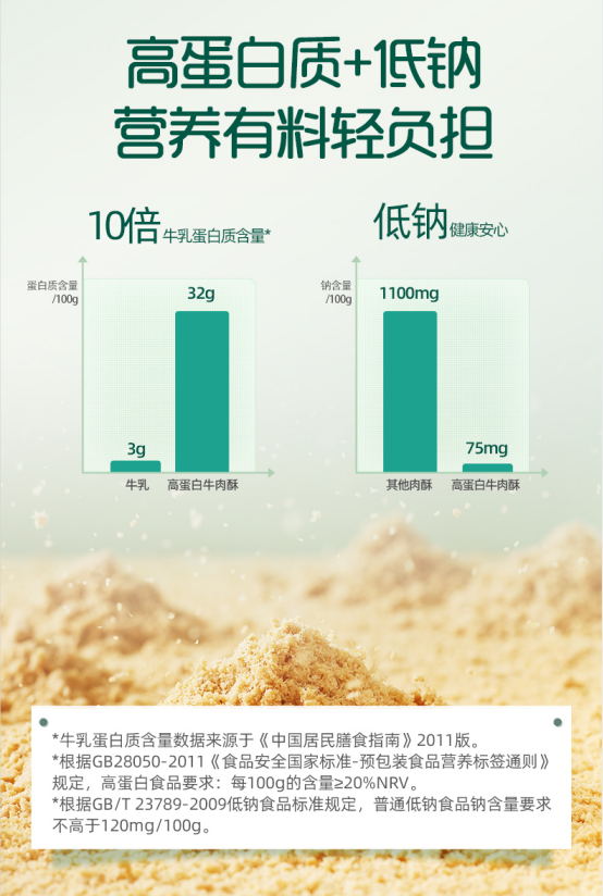 英氏高蛋白牛肉酥每100g蛋白质含量是每100g牛乳蛋白质含量的10倍,对于生长发育迅速的宝贝们来说,这份营养很有必要。