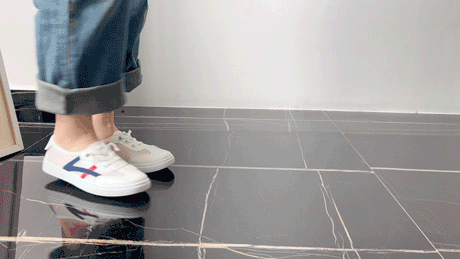 小白鞋在木板上倾斜,就像又八爪鱼在吸盘一样的抓地力,牢牢抓住板面,在湿润地板上减少滑倒的可能,更稳固,更安全。