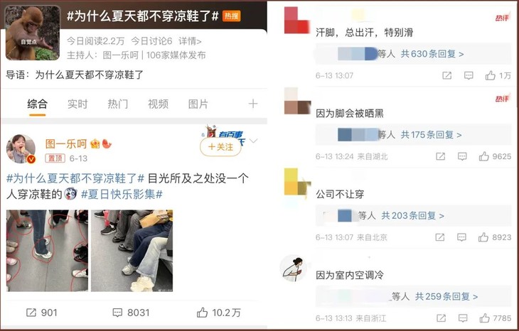 但是放眼望去大街、公交、地铁里,都是清一色“运动鞋大军”,丝毫没有因为天气热而减少~