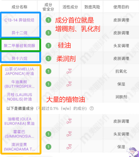 小分子硅油填补毛鳞片,精油滋养+形成油膜,质感轻盈,所有发质都能用。虽然不想承认,但让头发毛鳞片闭合、柔顺的,还得是硅油。再加上滋润力非常出色的霍霍巴籽油、鳄梨油、油橄榄果油来打配合。快速且有效修护受损毛鳞片,柔顺有光泽的头发当然说来就来!每次用它,就像在外边店里做护理一样,发丝顺滑、有光泽。为了平衡肤感,它还用到了华熙生物独创的「+水」复配分子技术。香味也很想大夸特夸,淡淡的果木调,不会特别浓郁上头。