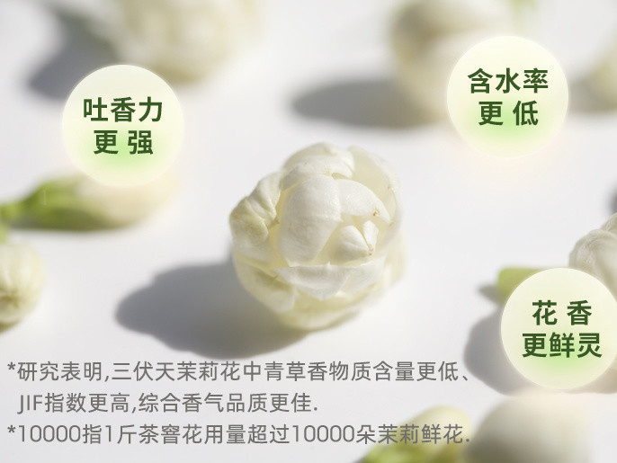 研究表明,三伏天茉莉花中青草香物质含量更低,综合香气品质更佳。吐香力更强,含水率更低,花香更鲜灵。