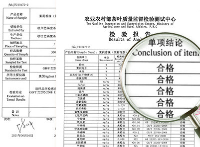 权威质检中心检测,5项理化,65项农残,感官审核全部合格,让你买的放心,喝的安心。