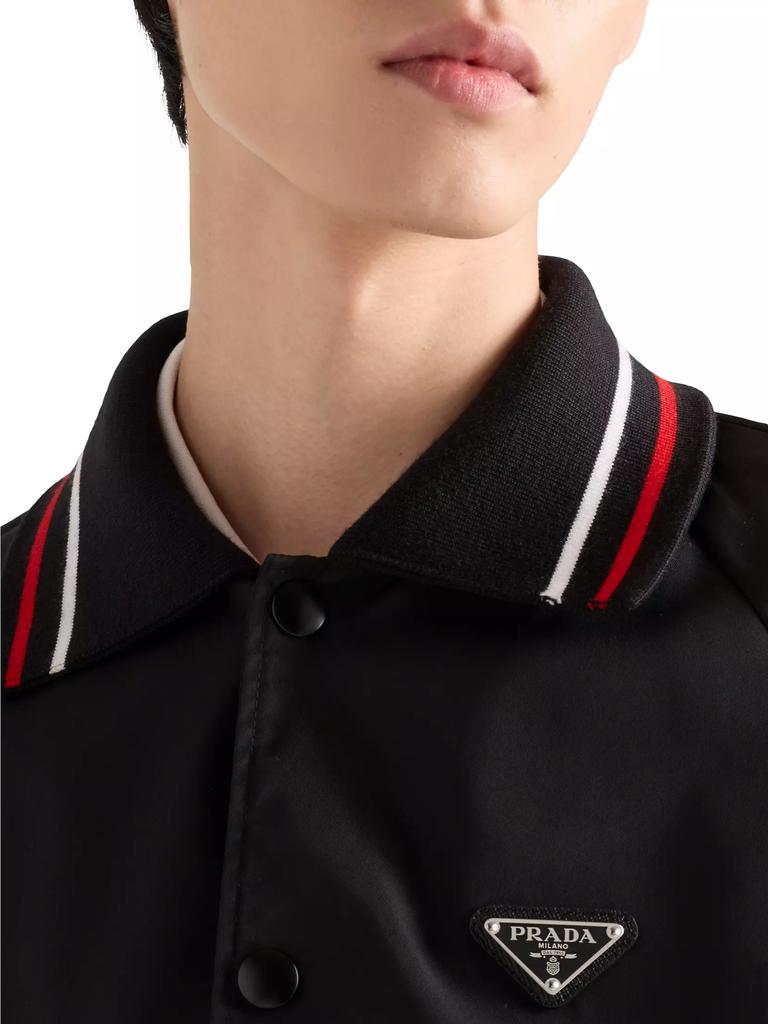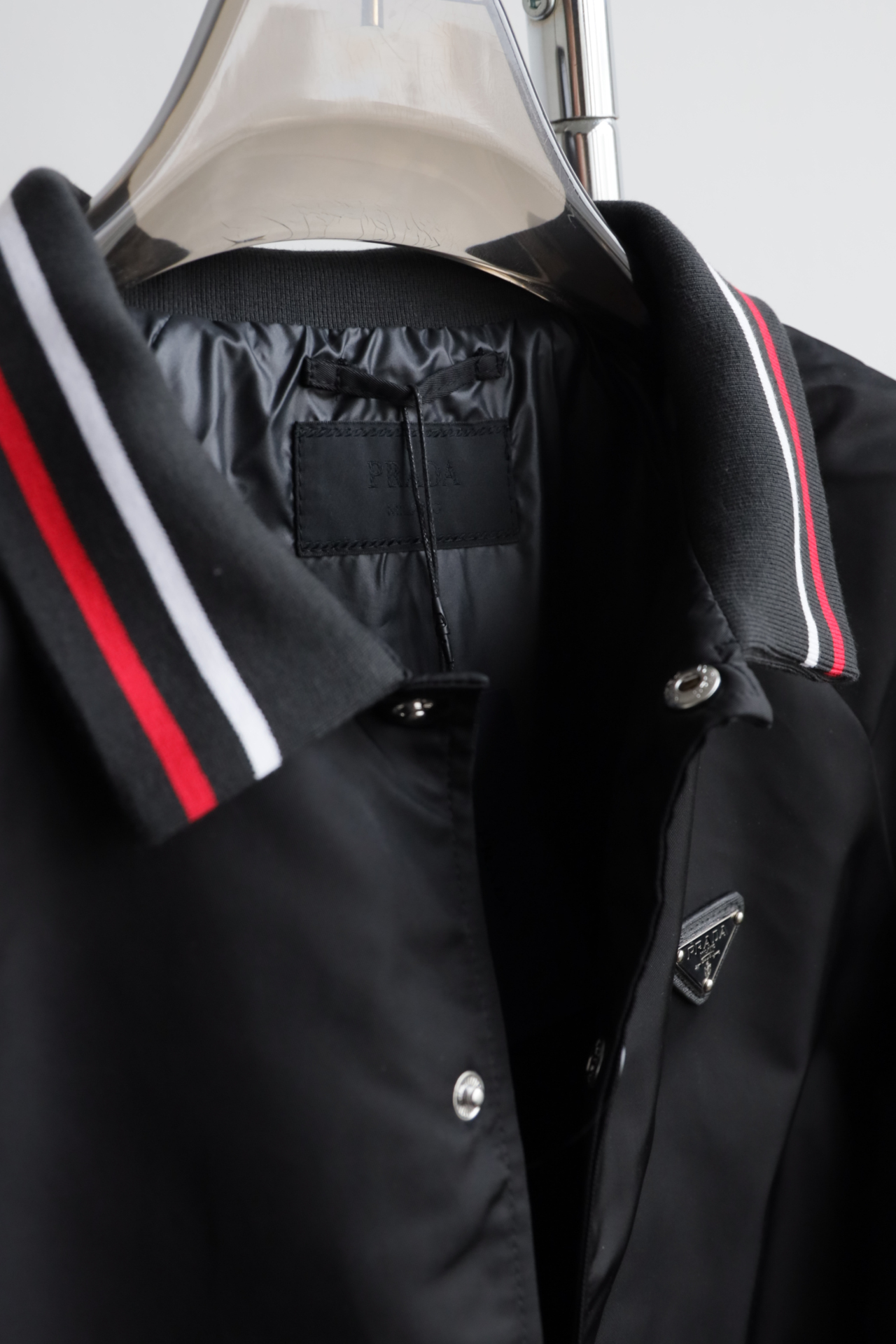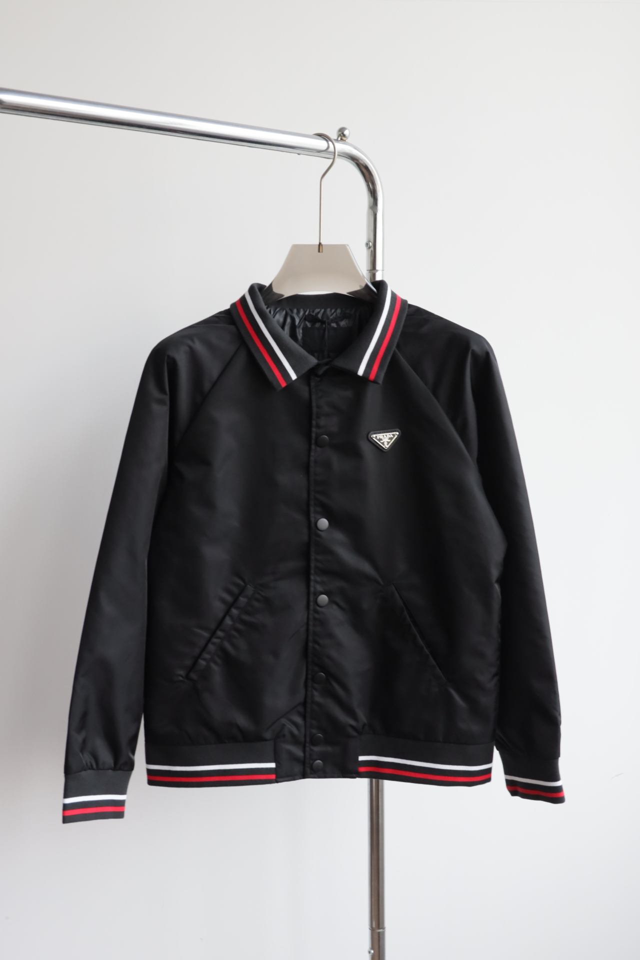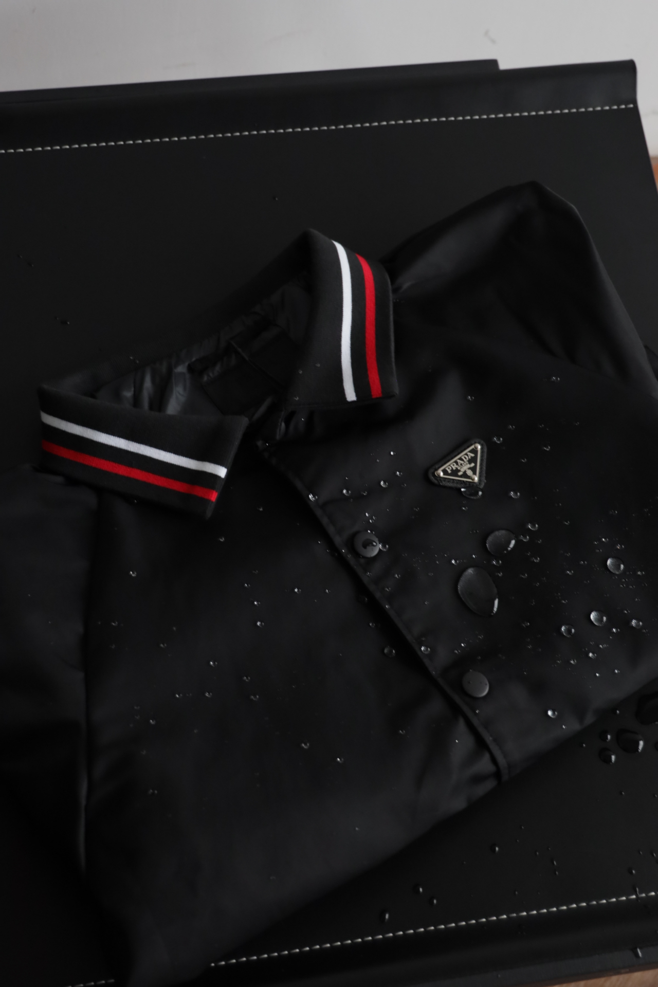 点缀罗纹袖口与针织领,胸前经典三角形徽标。按扣开合,经典百搭
