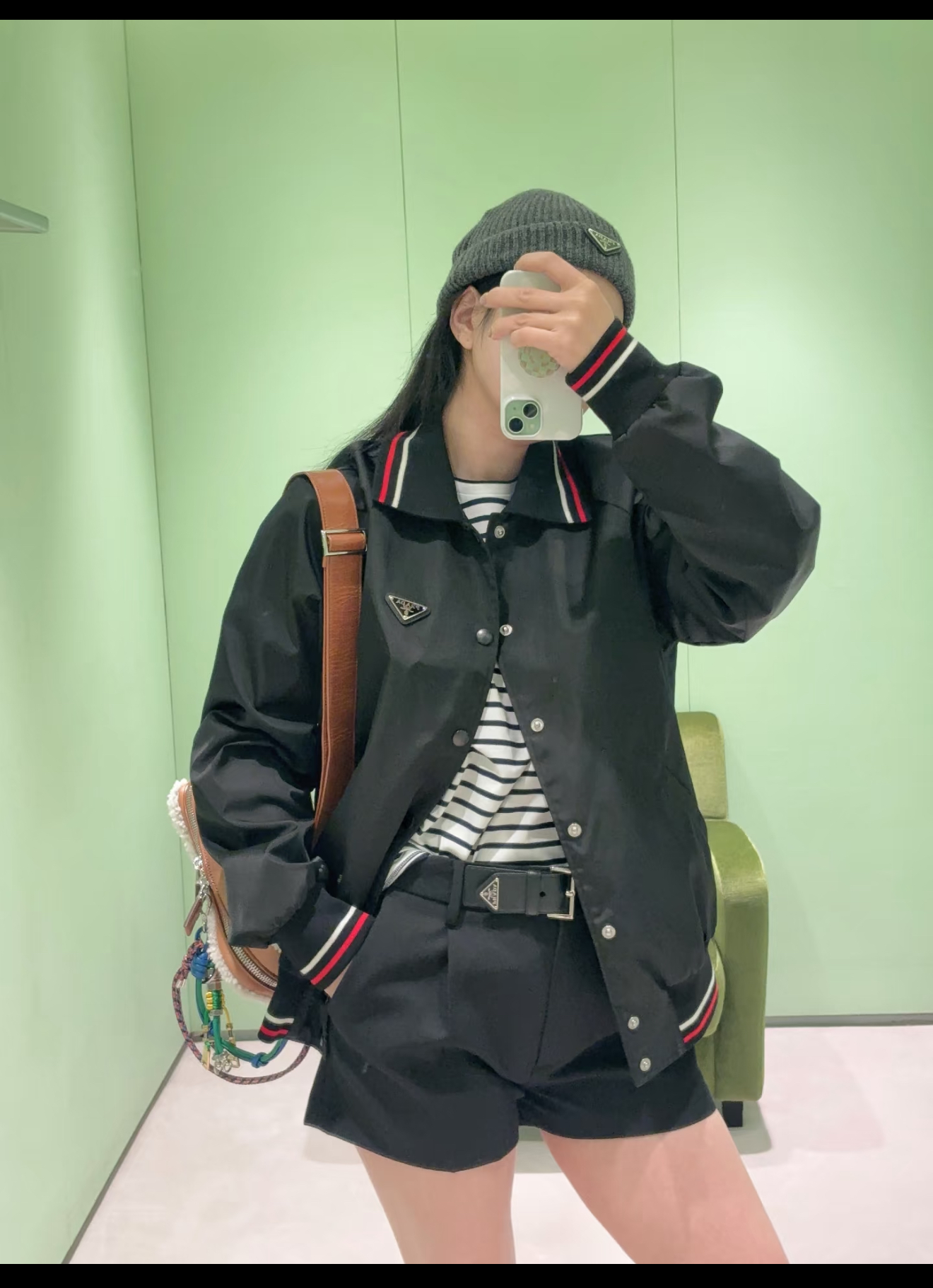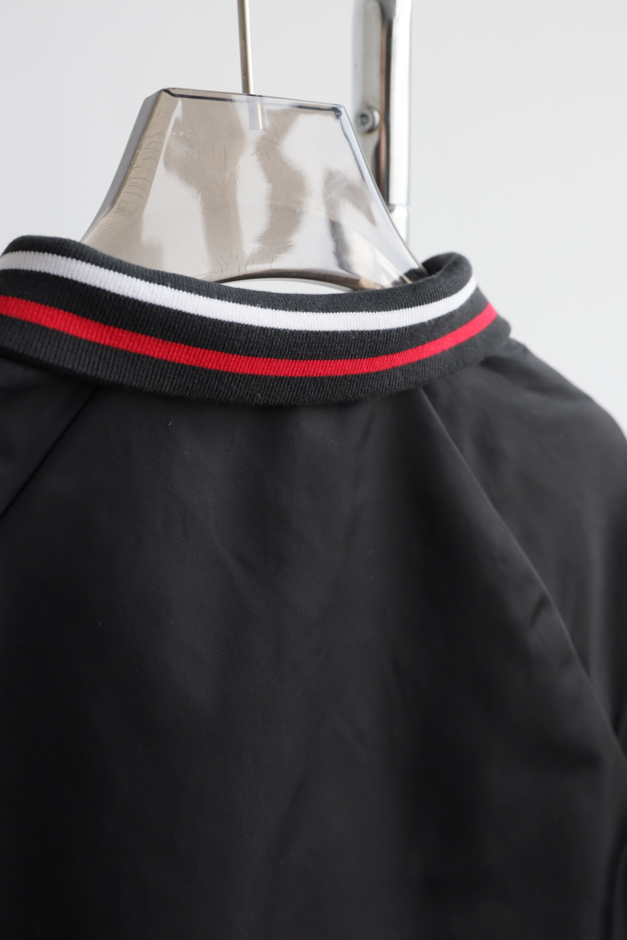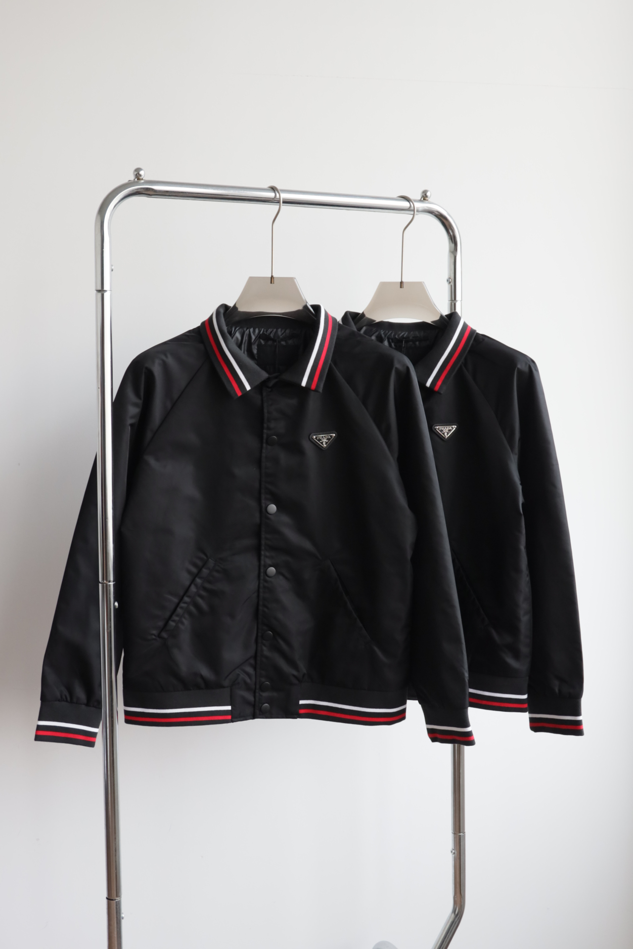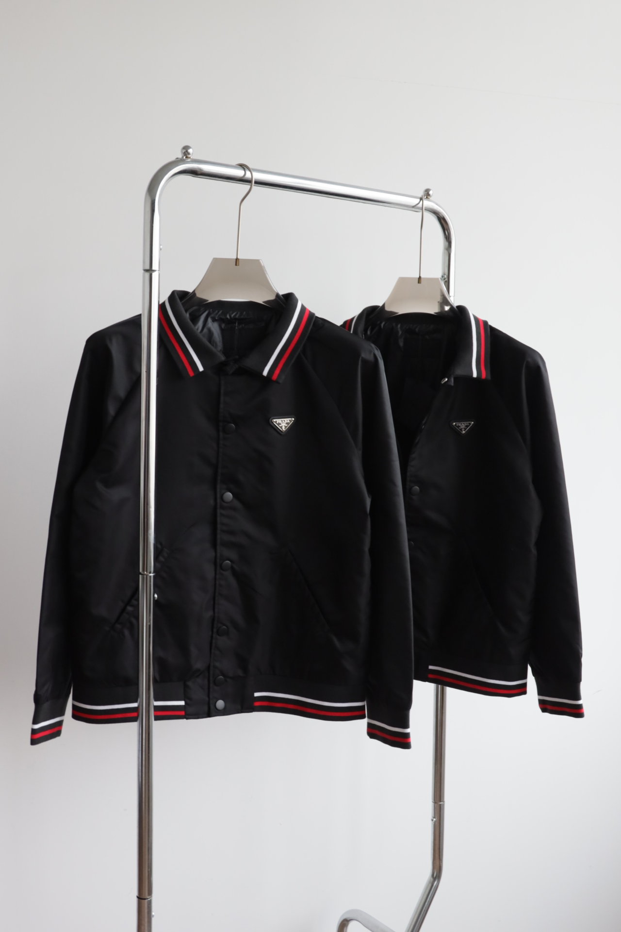 点缀罗纹袖口与针织领,胸前经典三角形徽标。按扣开合,经典百搭