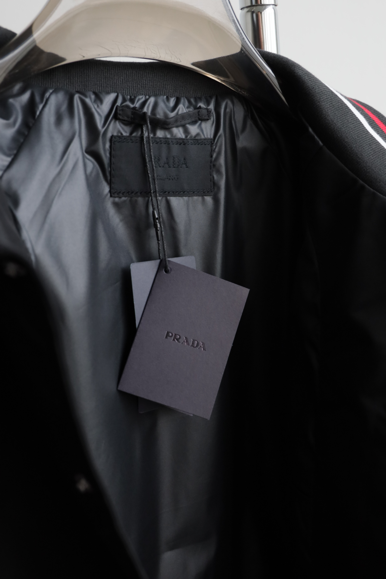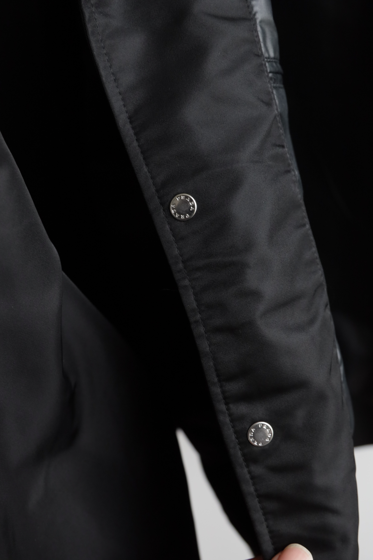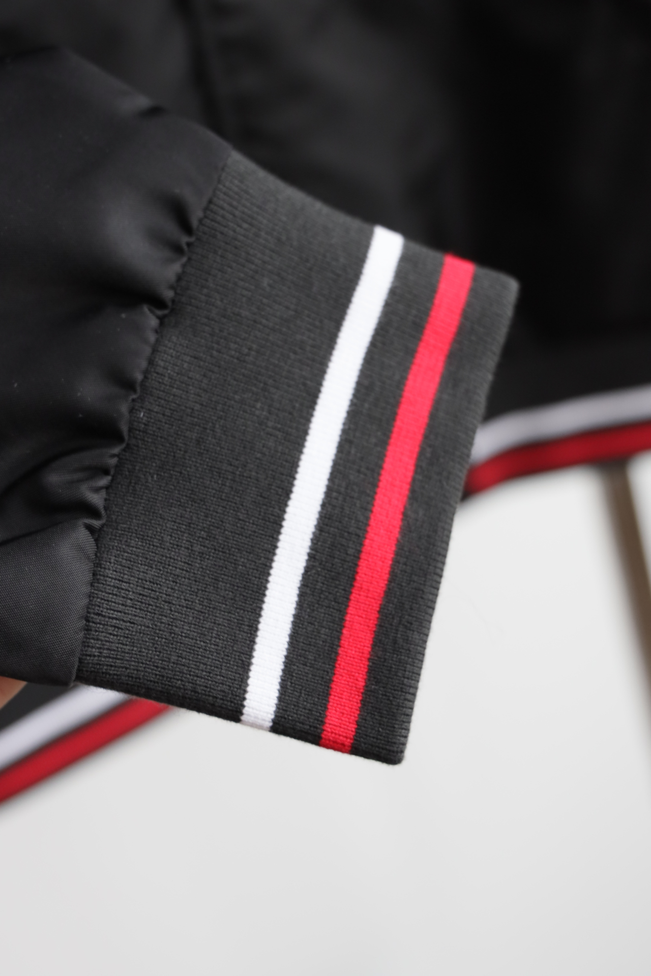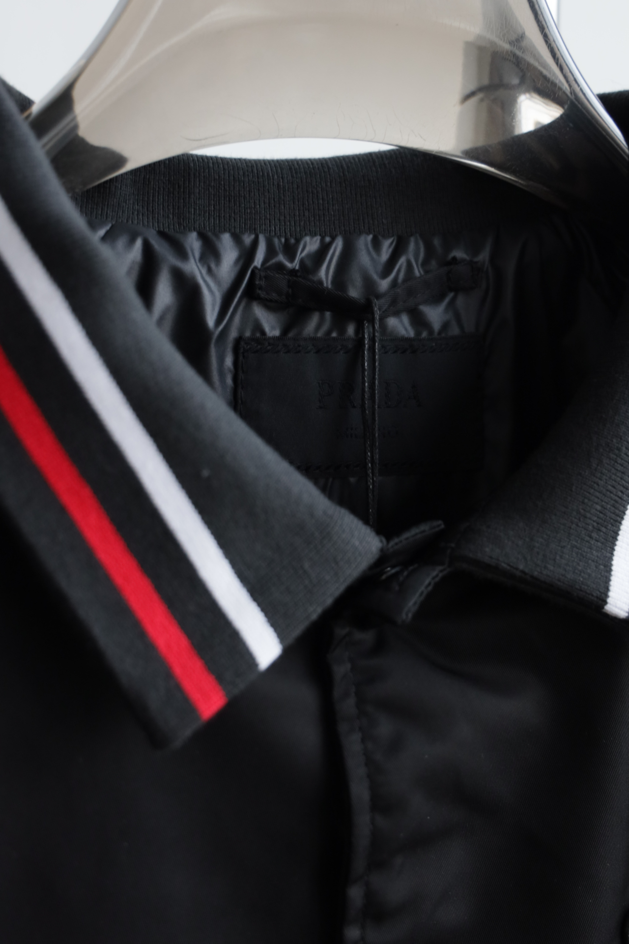 点缀罗纹袖口与针织领,胸前经典三角形徽标。按扣开合,经典百搭