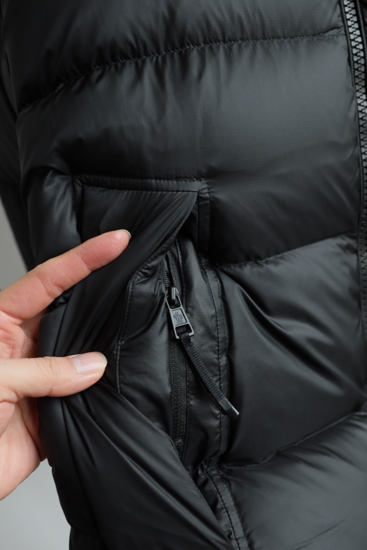 采用细密抗撕裂面料制成,填充羽绒,可拆卸可调节兜帽