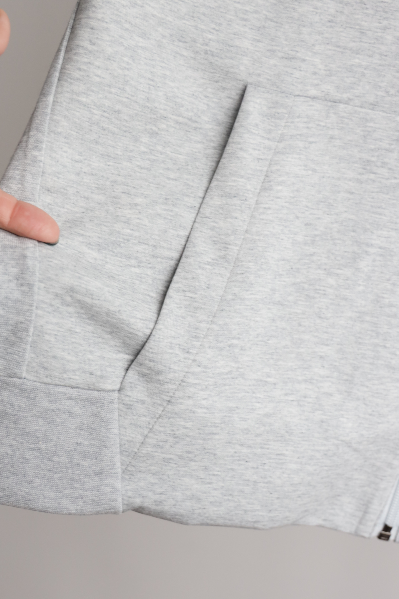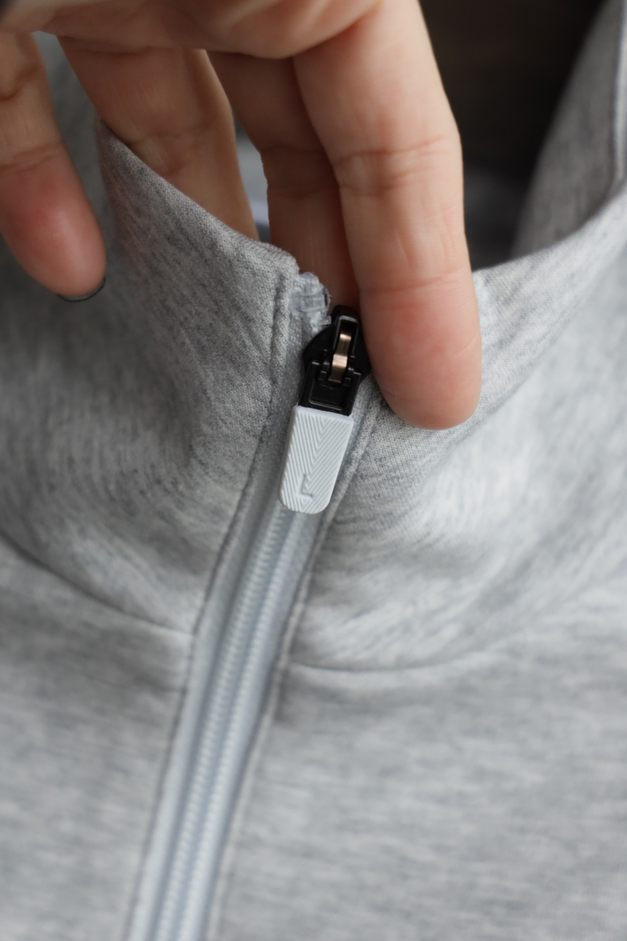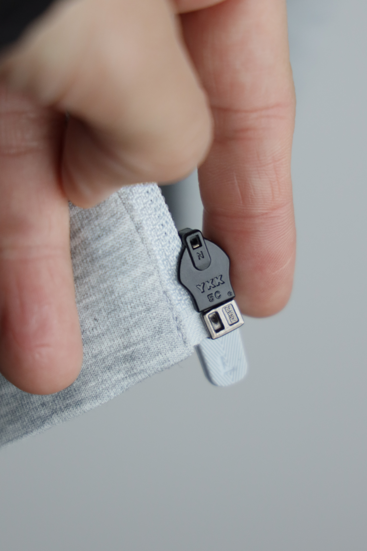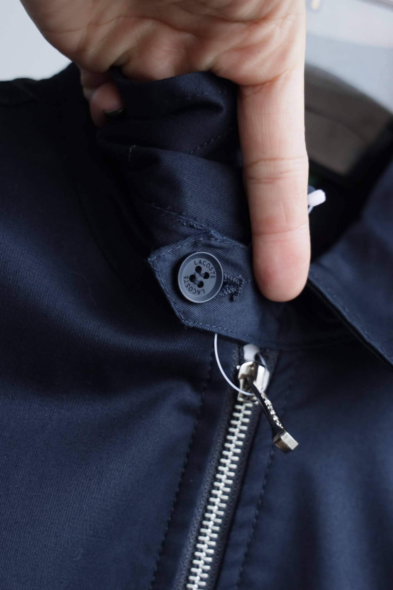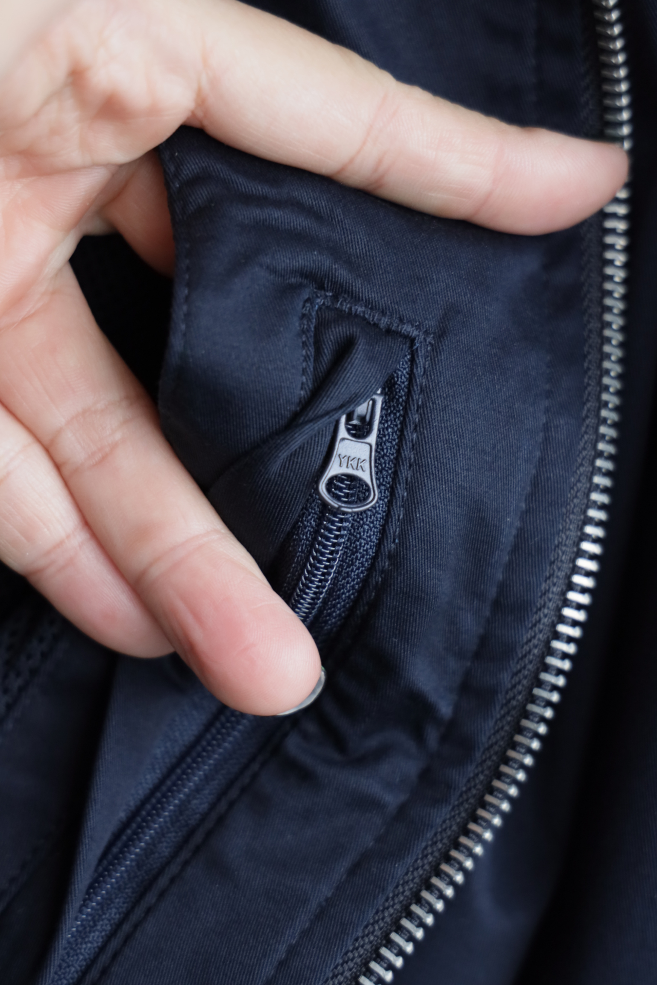 经典衣领和拉链开合,纽扣前袋、拉链内胸袋以及可调节的底部和袖端