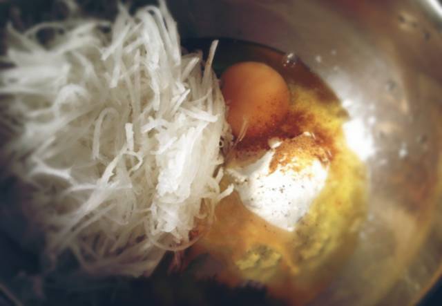 2、将萝卜丝中加1个鸡蛋,小葱末,香菜末,1大捏盐,搅匀杀出水;