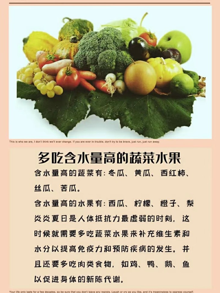 含水量高的水果有:西瓜🍉、柠檬🍋、橙子🍊、梨🍋炎炎夏日是人体抵抗力最虚弱的时刻,这时候就需要多吃蔬菜水果来补充维生素和水分以提高免疫力和预防疾病的发生。并且还要多吃肉类食物,如鸡🐔、鸭、鹅、鱼🐠,以促进身体的新陈代谢。