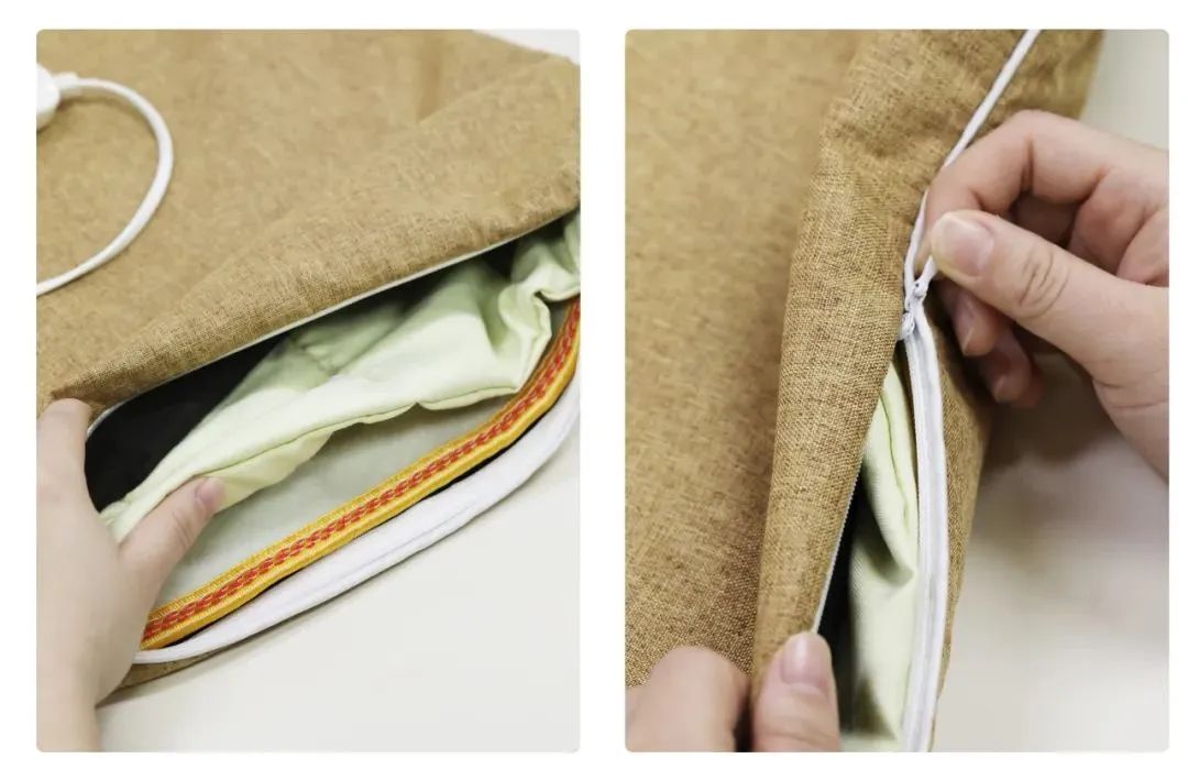 采用隐形拉链设计,打开后里面藏着艾绒内芯,艾绒内芯和加热层拿出来,外面的套垫就可以单独清洗了,真的超级方便!