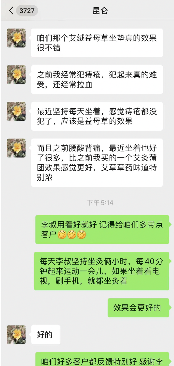 55岁的李叔坐了一阵子这款艾绒益母草加热坐垫,反馈痔*疮近期犯的少了