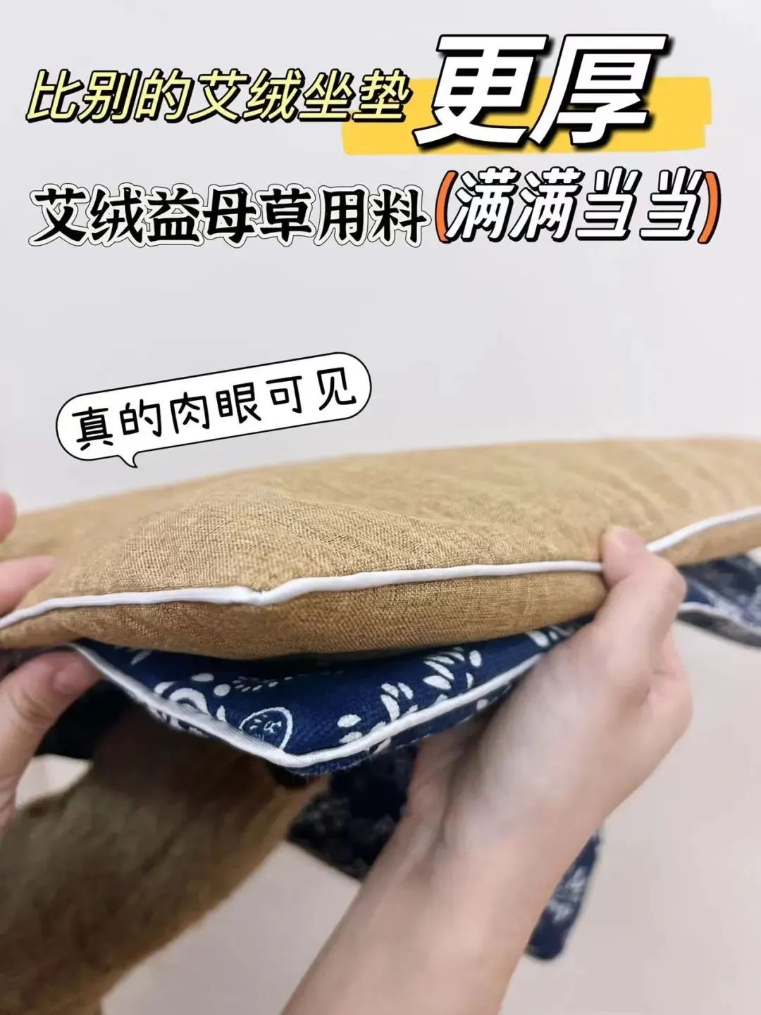 不仅如此,咱们这款艾绒坐垫比其他款的艾绒坐垫足足厚了起码约3倍!内料真的足!