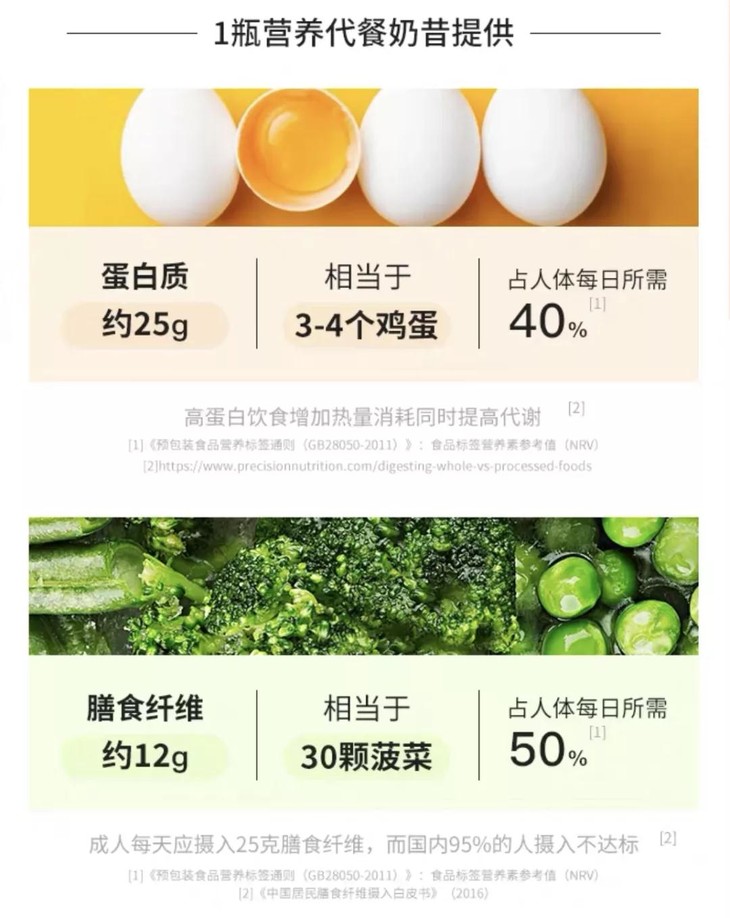 每瓶代餐粉容量是75g,蛋白质含25g左右,相当于3-4个鸡蛋,能补充每日所需蛋白质的40%,代两餐吃的话再正常吃一顿饭,蛋白质营养能得到完全的补充。