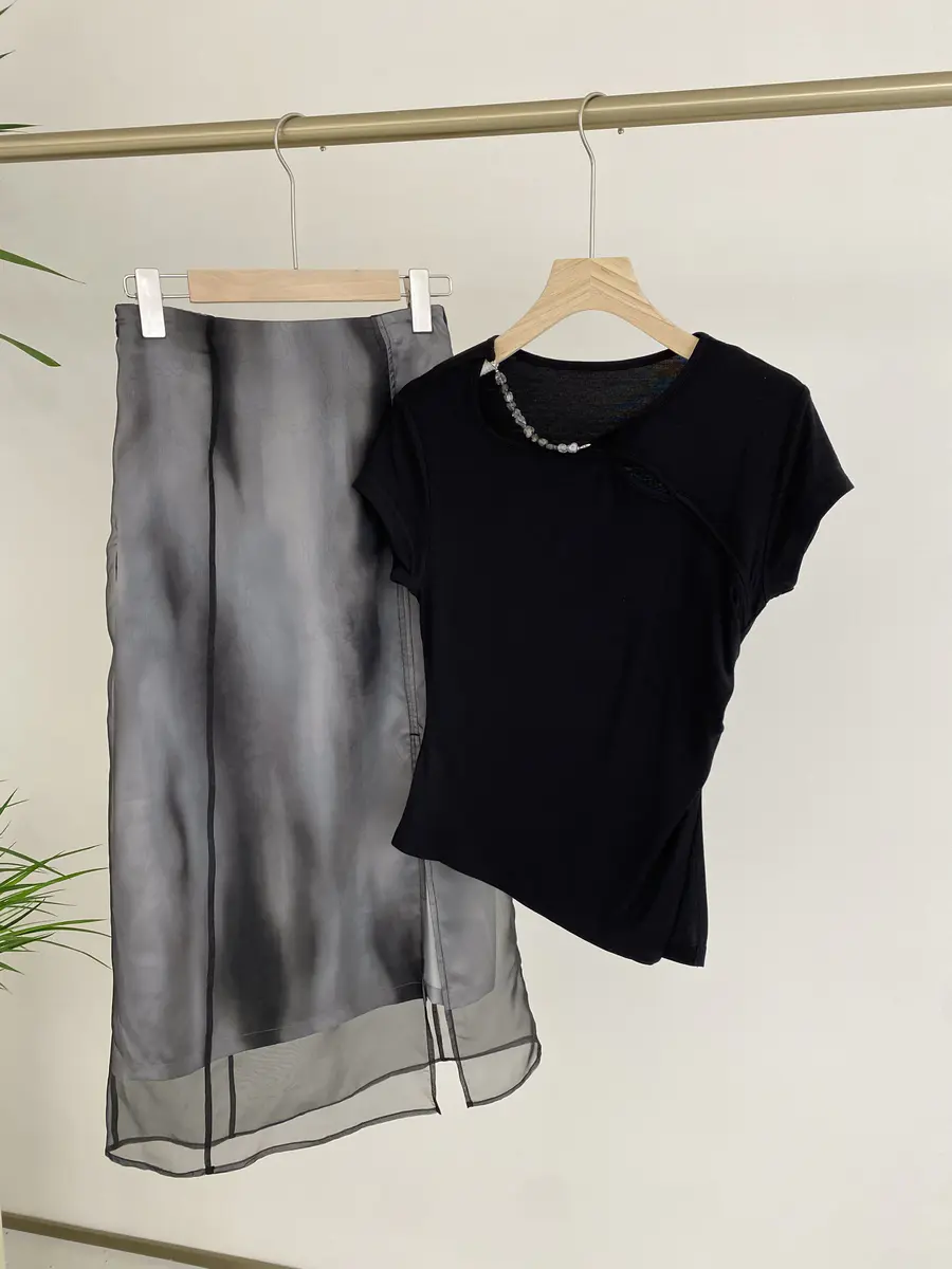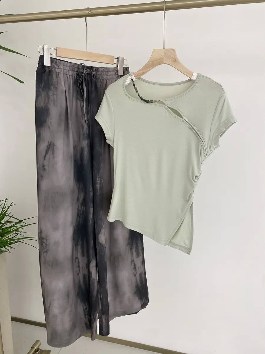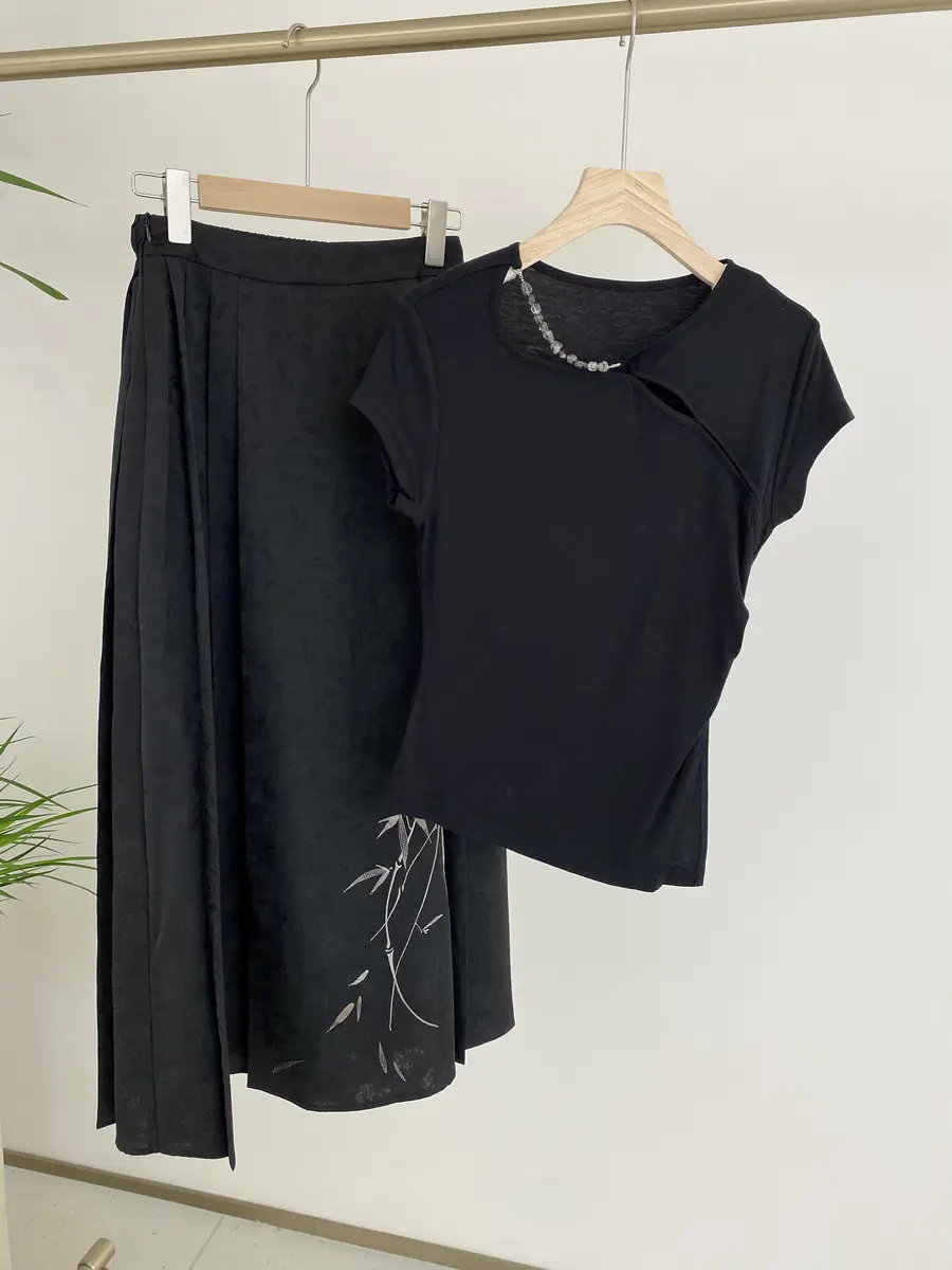 T恤本身属于比较百搭的单品,这款改良T恤还是属于比较有女人味的,所以搭配新中式裙装,或者印花阔腿裤都是不错的选择