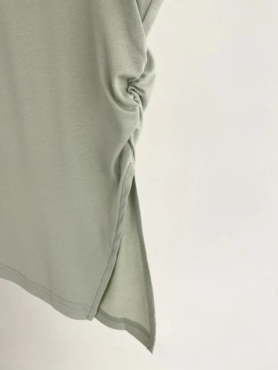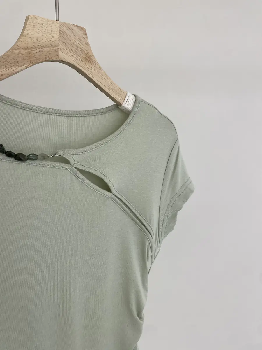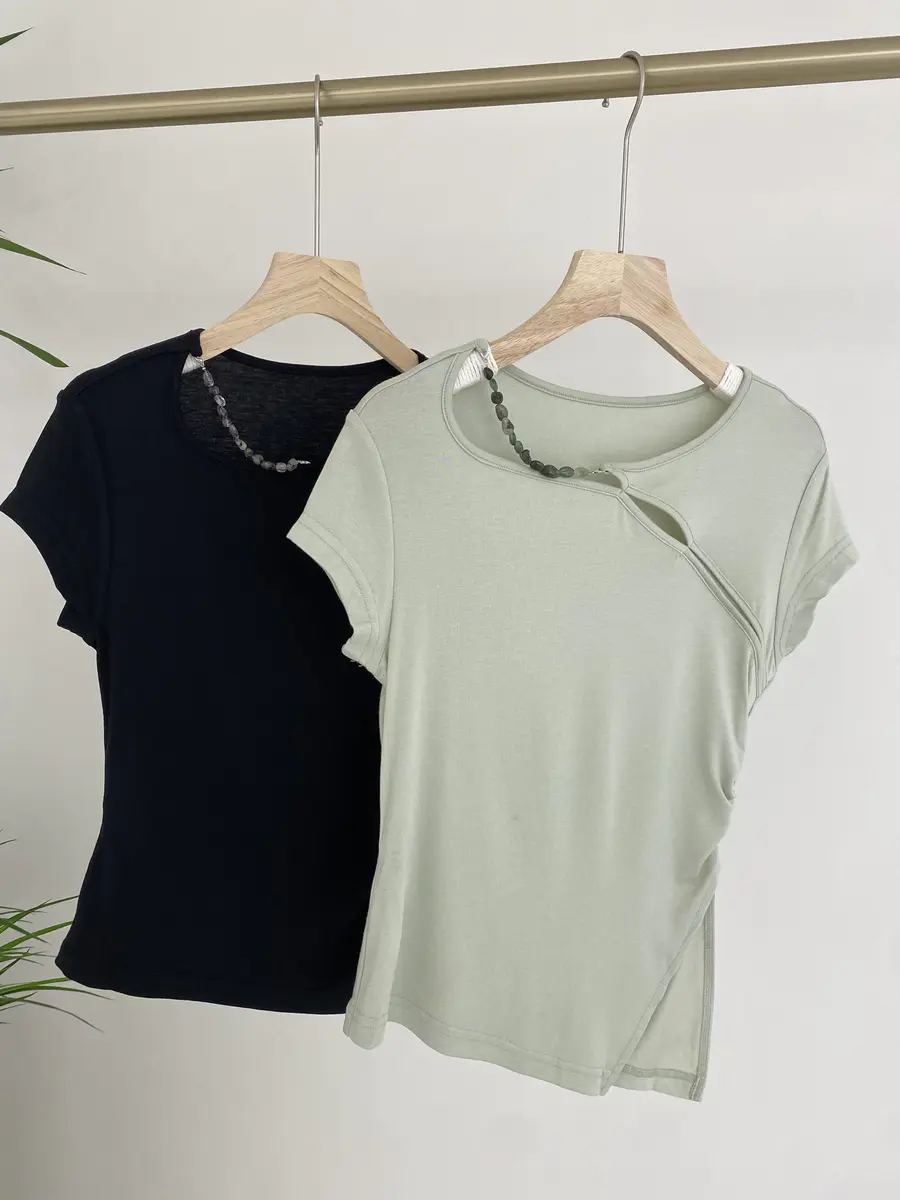新中式的常态化延伸出很多日常好穿的单品,这款修身双色T恤就是结合中式细节设计打造的,首先是领口斜边挖空的设计,灵感来源于旗袍的门襟,侧边开叉抽褶,犹如旗袍的裙摆开叉设计,优雅又女人味十足
