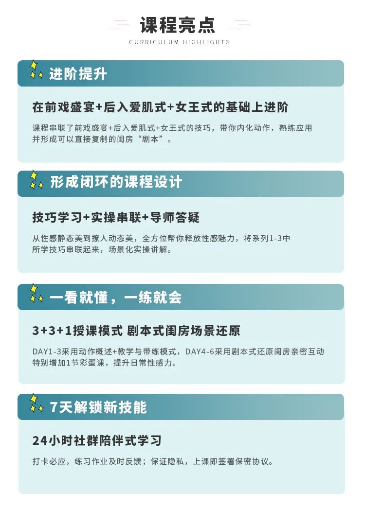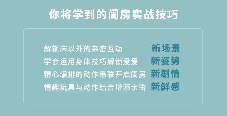 带领大家把手口技巧、后入式技巧、女up位技巧,这些单一场景的动作技巧有机地串联起来,让你不止有一进一出间的欢愉,而是充满想象,变成一套完整的闺房亲密互动流程。