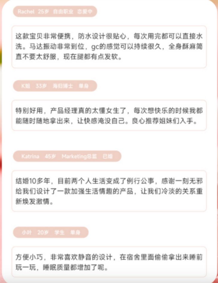 虽然是个新品牌,但一刻无邪认为每个女生都有探索快乐的权利,并且它的玩具也有好几款,有不同的功能,分别适合不同需求的女性。