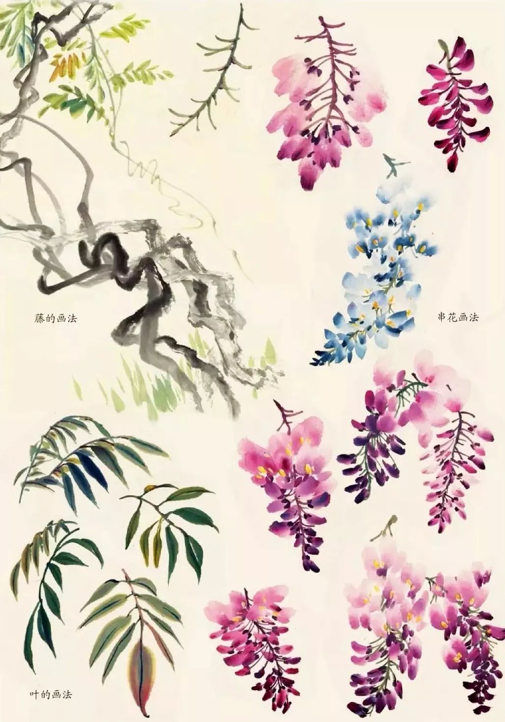 串花的画法:以花朵为基础重叠组合成串,在空隙中点画花柄、花梗,调白粉、藤黄在串花中有疏密地点蕊。