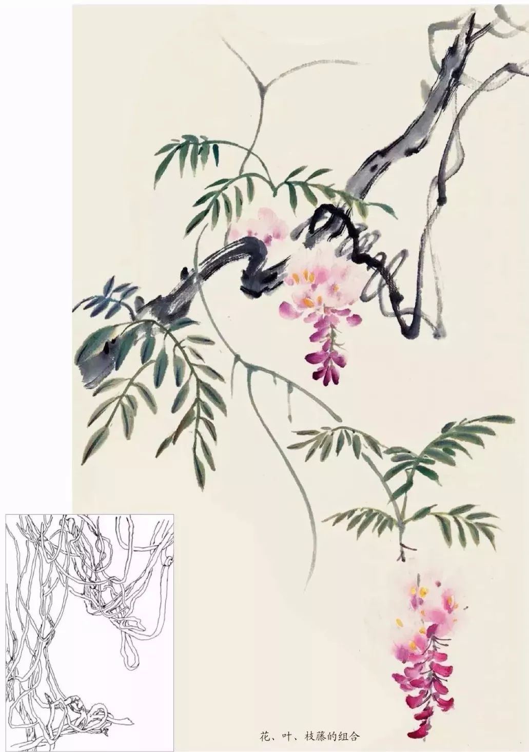 藤的画法:嫩藤用汁绿(或淡墨)以中锋勾写。中老藤用墨(或墨加赭石)以中、侧锋灵动用笔画成。要强调藤条的柔韧与转折。