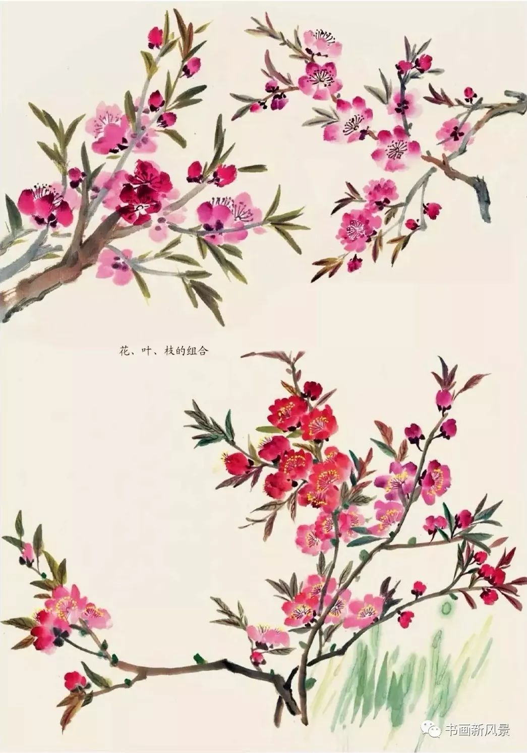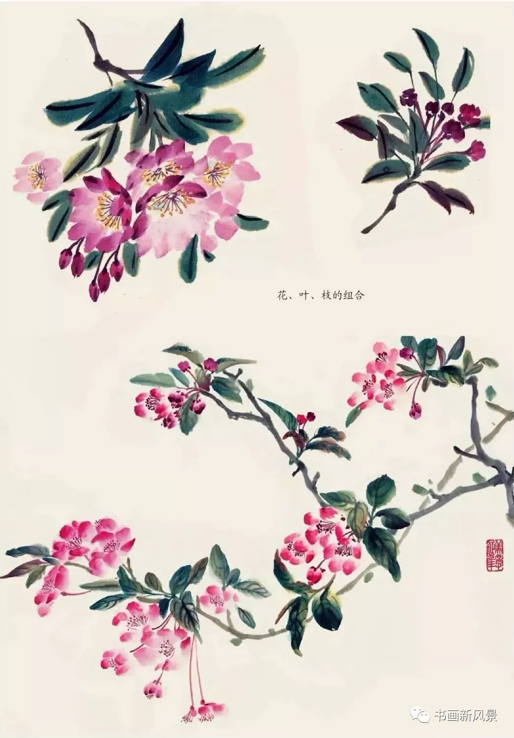 花、枝、叶组合:要注意花朵的聚散,颜色的浓淡,枝干的取势及疏密变化。