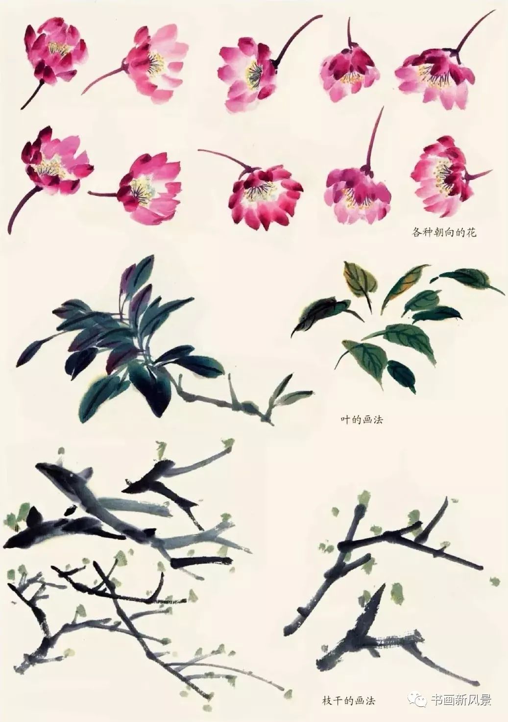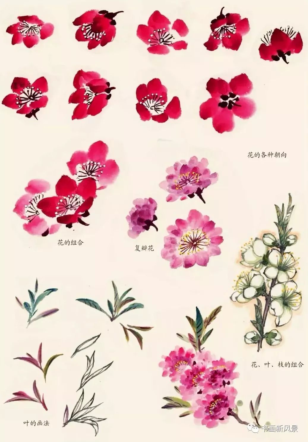 叶的画法:笔调汁绿色笔尖蘸曙红(或花青、墨)撇写,用胭脂(或墨)色勾筋。