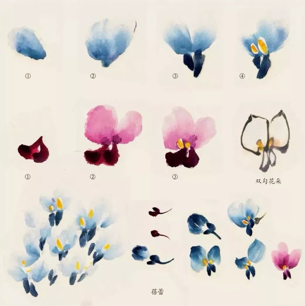 花的画法:笔调花青加白色(紫色花用曙红加酞青蓝加白色),笔尖蘸浓花青(或深紫色)点厾花朵上面的两大片花瓣,再蘸浓色点下面两片小花瓣。白粉加黄色点两点花蕊。
