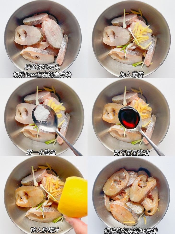 ❶鲈鱼洗净去头切成1cm左右的鱼片块,加入葱姜,放一小匙盐,两勺宝宝酱油,挤入柠檬汁,抓拌均匀腌制15分钟