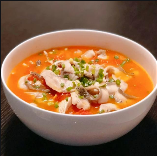 6.等番茄成浆后,加入适量清水煮沸,加入适量盐和糖调味,煮开后再小火炖到汤汁比较浓时,放入鲈鱼片,大火煮,待鱼片变色后,调成小火煮3-5分钟,不能煮太久,以免鱼片煮老。