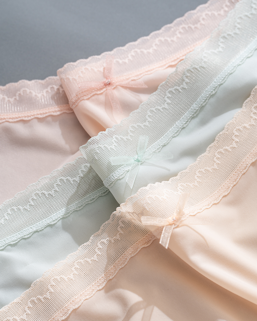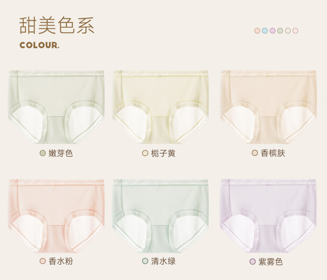 这款内裤一共做了六个颜色:香水粉、栀子黄、清水绿、紫雾色、嫩芽色、香槟肤。
