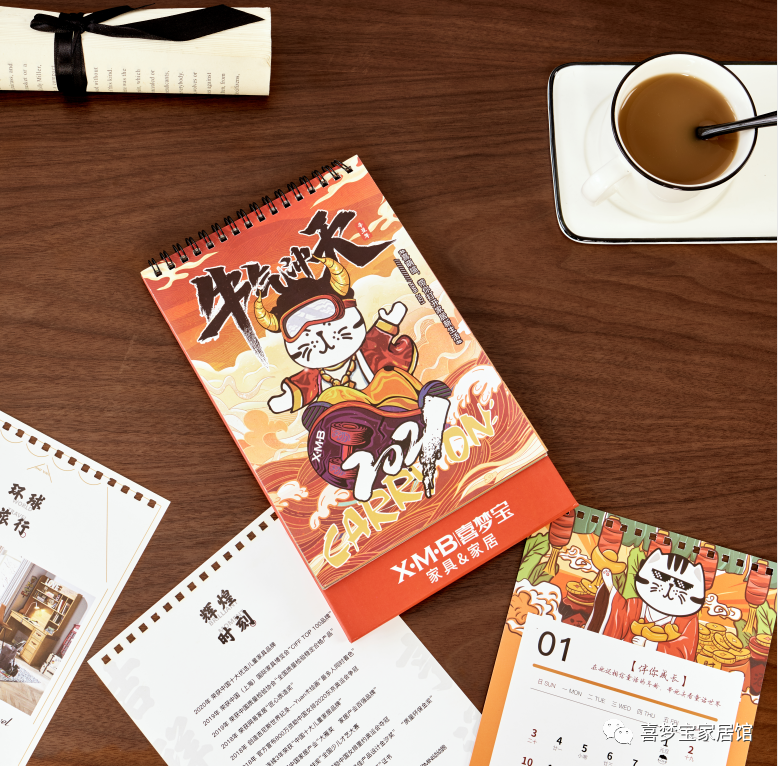 国潮牛年台历本,材质采用彩色印刷,整体细腻笔触,光滑整洁,底座折叠厚实,站立妥妥的稳固不倒,萌萌可爱的喜萌猫,朝气蓬勃的卡通形象,想一年二十四个节气都伴你左右。