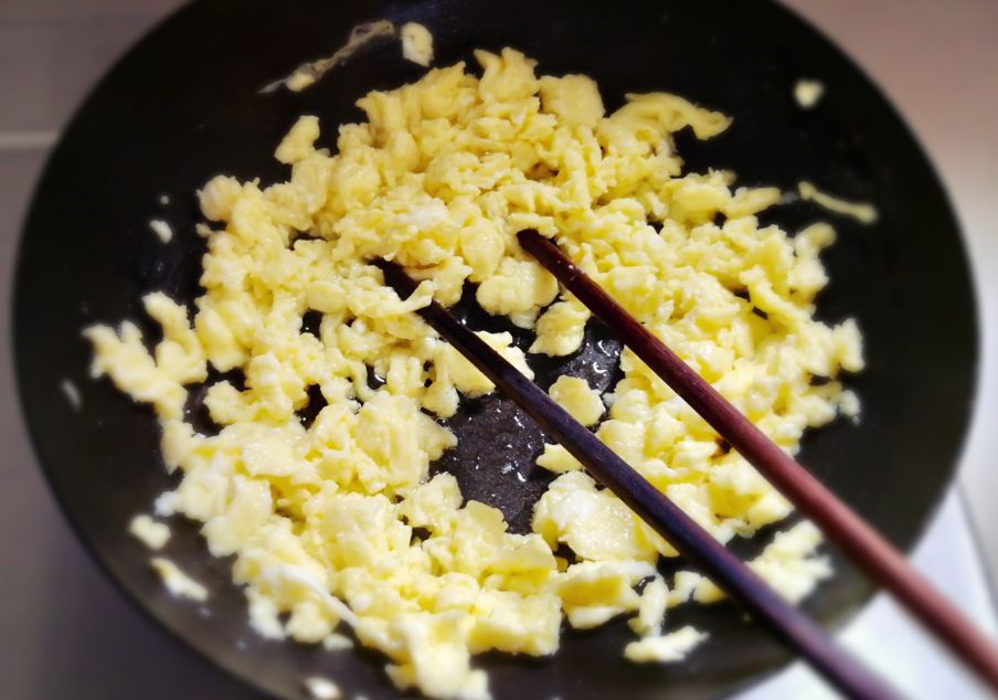 1、锅中放两汤匙豆油,微微起烟后,将蛋液顺着锅边倒入,用筷子迅速划散,待鸡蛋凝固后关火,盛出放凉;