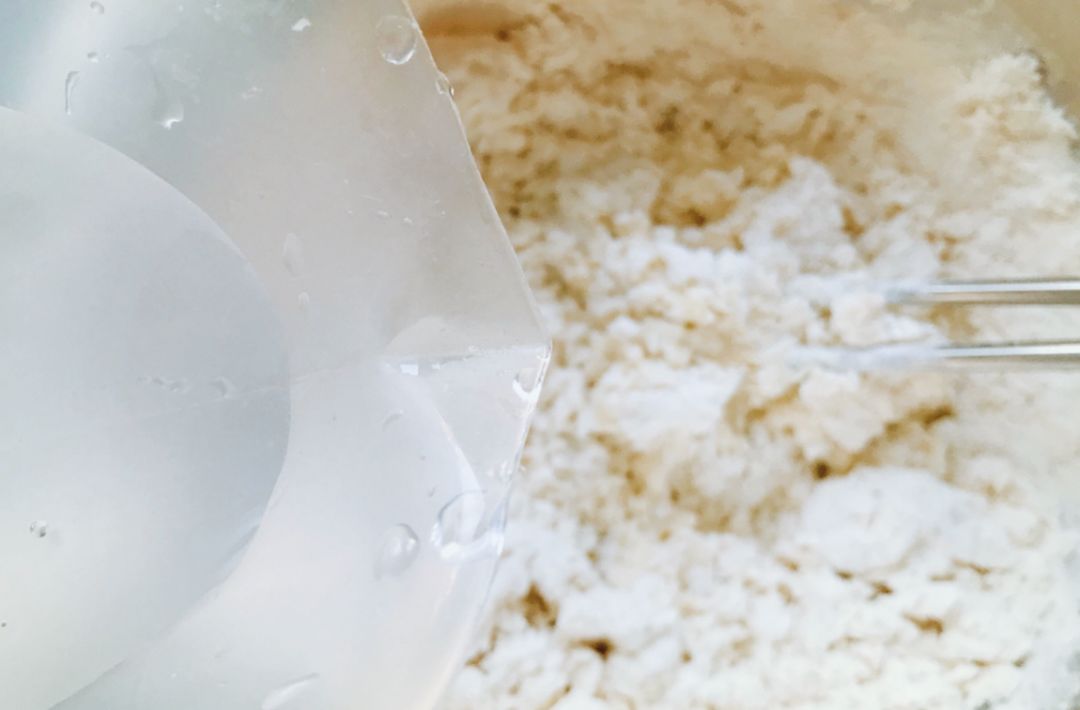 1、将1斤白面添3两开水搅匀后,再添2两凉水,1小捏盐,和匀揉成面团,刷一层油,醒发90分钟备用;