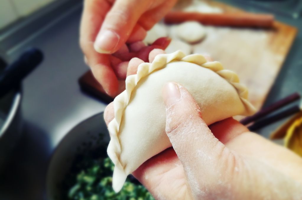 4、将韭菜馅放入其中包好,再根据喜好捏上花边;