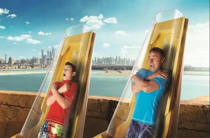 海神之跃则需在接近25.1米高的起点纵身一跃,顺着近乎垂直的水滑道极速下落,最终以20.2米/秒的速度穿越透明的鲨鱼池隧道。