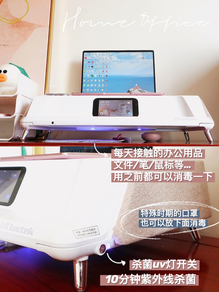 而且这个桌子还有UVC-LED杀菌功能,只要点击侧面的按钮,15秒后,底部就会亮起紫色的光芒开始消毒啦。近期我们不是都要带口罩通勤吗,这方面的消毒就可以交给它啦。我们平时经常使用的的鼠标、键盘和笔等办公用具也可以隔断时间进行10分钟杀菌消毒,卫生安全还是很重要哒~