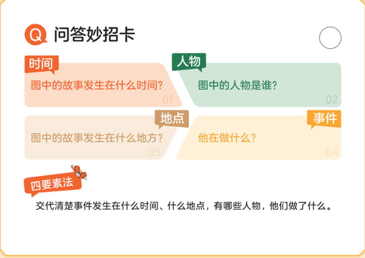 第二大板块就是分析真题本身了,4个引导问题,正好对应着四要素,又再应用一遍这个真题所学到的四要素法,孩子的启蒙学习,很重要的一个原则就是需要多次重复。