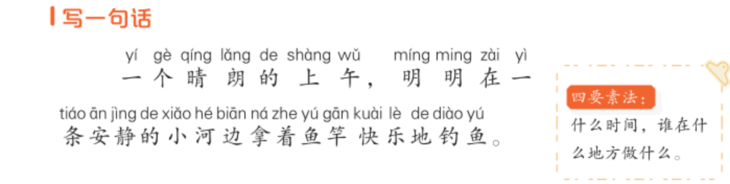 写话方法在这个真题中运用到了四要素法,也就是时间、人物、地点、事件,直接把刚才的文本拆成四要素,强化孩子对这个写话方法的认识。