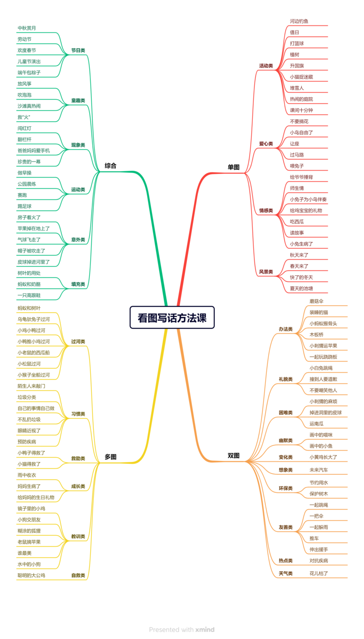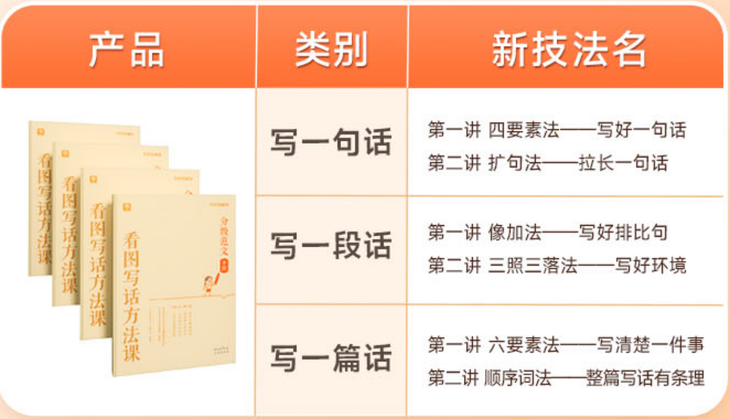 4本看图写话方法教材,是按照单图、双图、多图、综合来分类的,也是由易到难的顺序,刚开始学看图写话的或者看图写话很困难的孩子,可以安排从头学习,从最简单的单图开始。