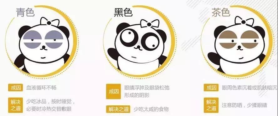 学生党和上班则容易产生青色眼圈和茶色眼圈。黑色的眼圈一般出现在年纪大的人身上比较多。